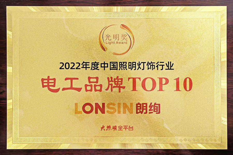 旗下電(diàn)工品牌朗絢LONSIN,憑借良好的品牌形象,精細的生產工藝,持續的創新(xīn)能力,獲得“2022‘光明獎’電工(gōng)品牌TOP 10”榮譽稱號(hào)。